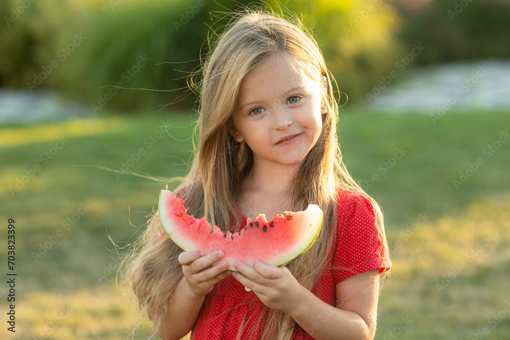 a little girl with long hair in a red dress eats a watermelon on the lawn. picnic in the park. happy childhood. space for text. High quality photo