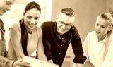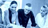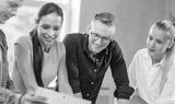 Team of young and confident startupers is working at the table in the office, discussing the strategy and development plan of the company. Business, innovation, brainstorming and teamwork.