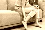 Foot pain concept, close up hand of young woman rubbing, massaging sore feet area of pain, girl suffering on sofa, couch at home. Discomfort painful feet ache from walking for long. Physical injury.