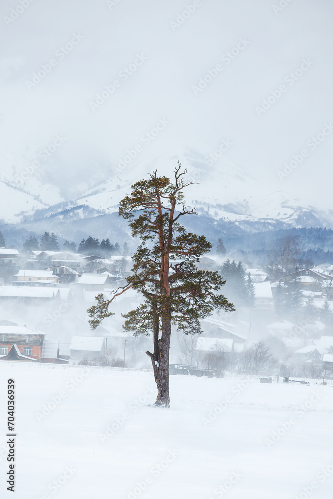 Isolated tree in the snow, the famous winter resort of Bakuriani