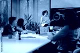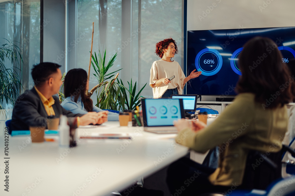 Hispanic latino woman team leader presenting project to its diverse colleagues