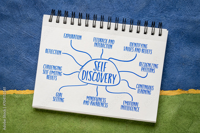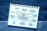 self discovery infographics or mind map sketch in a spiral notebook, personal development concept