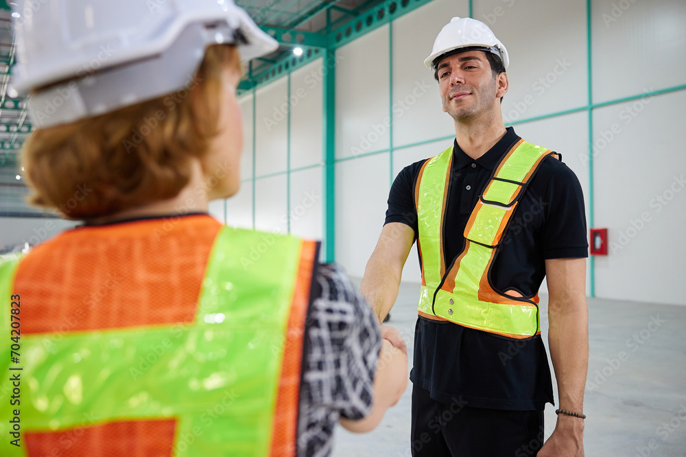 workers shaking hands before starting work in the warehouse storage
