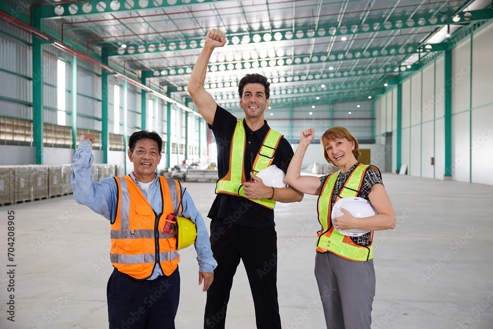 group of workers raise hand celebrate win pose after success work in the warehouse storage