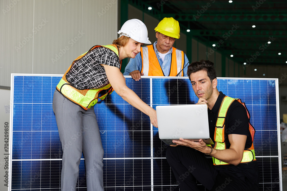 workers or technicians working on laptop computer and holding solar panel in the factory