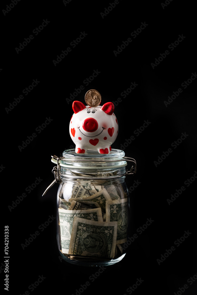 Glass jar with 1 US dollar bills and piggy bank on black background