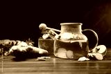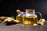 natural organic herbal tea in glass teapot on a wooden table