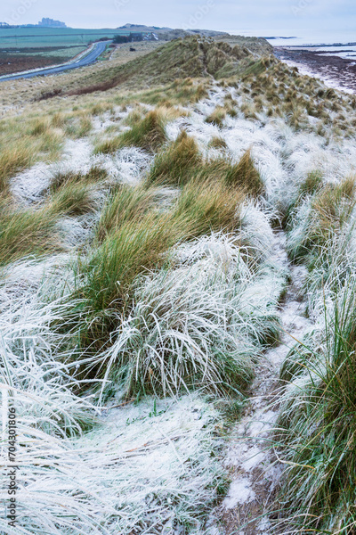 Beautiful Winter landscape of rare frozen frsoty grass on sand dunes on Northumberland beach in Northern England