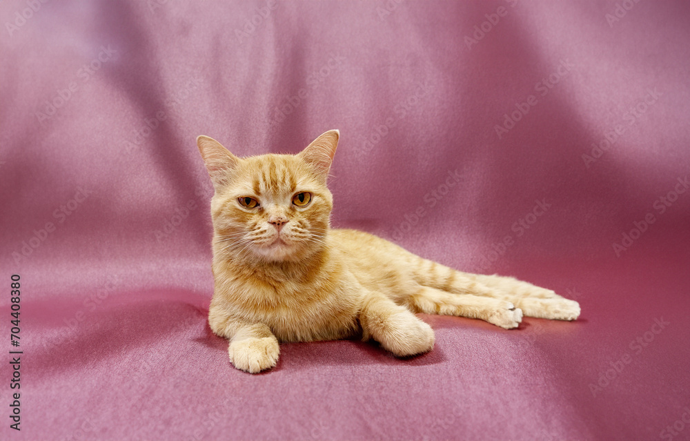 potrait domestic cat sitting on fabric and space for display pet produc on space