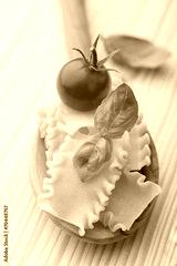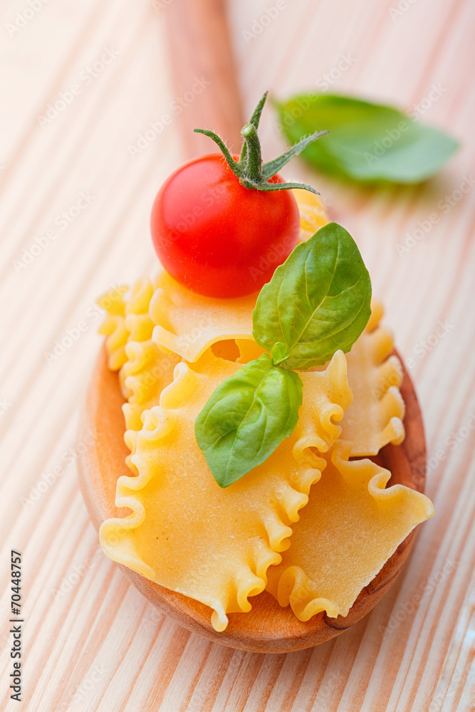 Pasta mit Tomate und Basilikum auf Holzlöffel