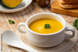 pumpkin carrot cream soup in white bowl,garnished with parsley.Healthy food
