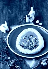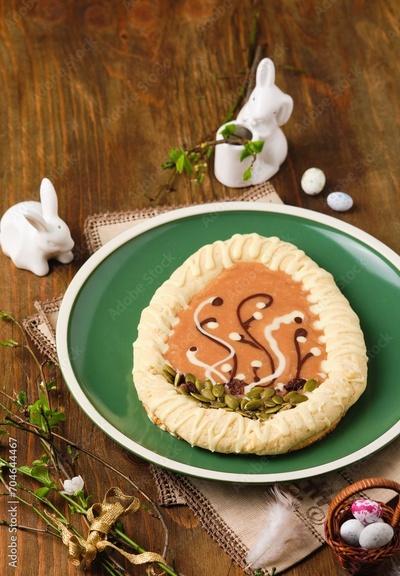Mazurek, Polish Easter sweet made from shortcrust pastry in the shape of an egg with Easter decoration on a green plate on a wooden background. Polish cuisine.