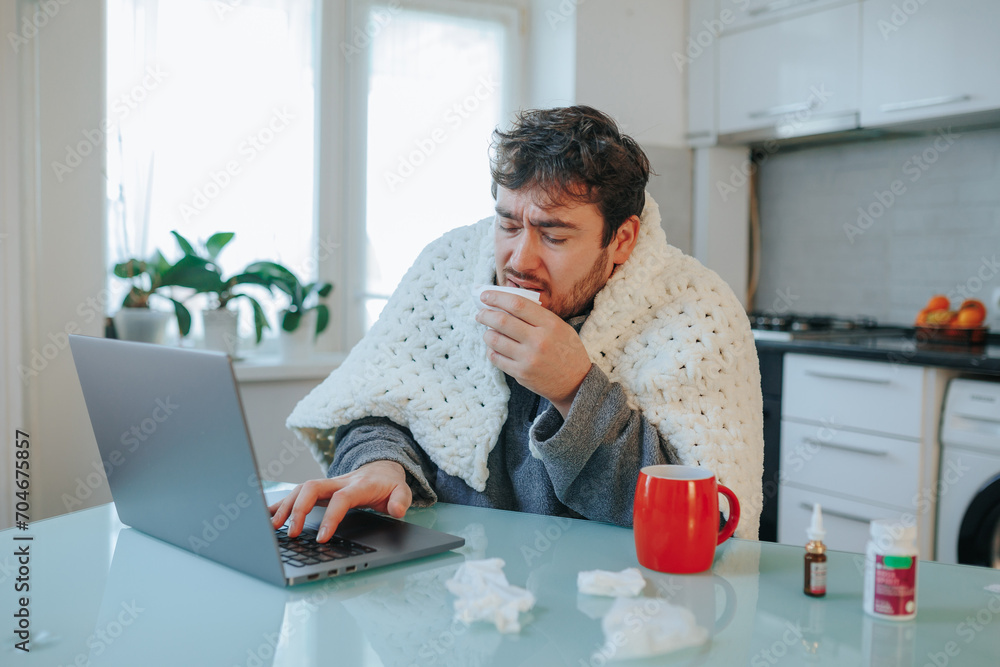 Home Office Struggles Bearded Caucasian Man Battles the Flu, Coughing and Sneezing by the Laptop