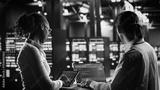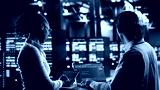 Coworkers programming in server hub housing advanced infrastructure storing massive datasets. Employees running code on laptop to update data center racks doing complex computational operations