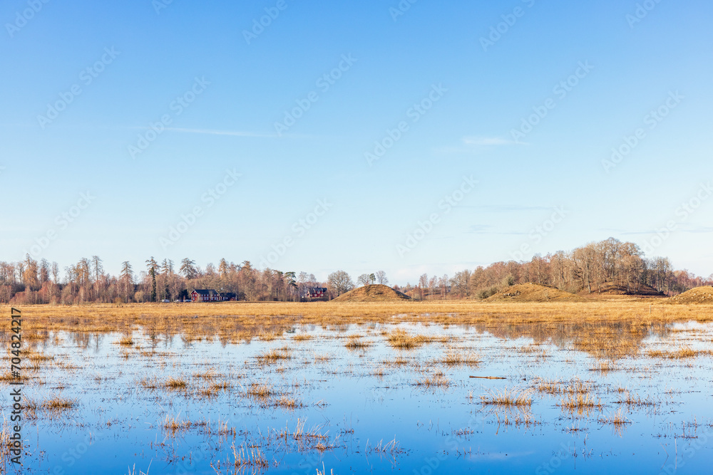 View at a flooded wet meadow with a hilly lakeshore at spring