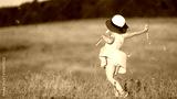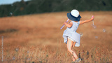 A little girl in a hat launches soap bubbles in the nature at sunset. Sparkling bubbles flying in different directions. Copy space.