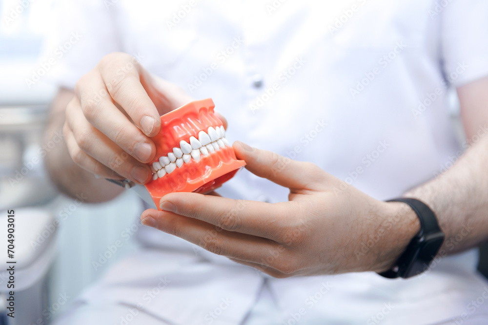 Concept dentistry, man dentist with gloves holding jaw model teeth, white background.