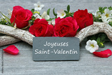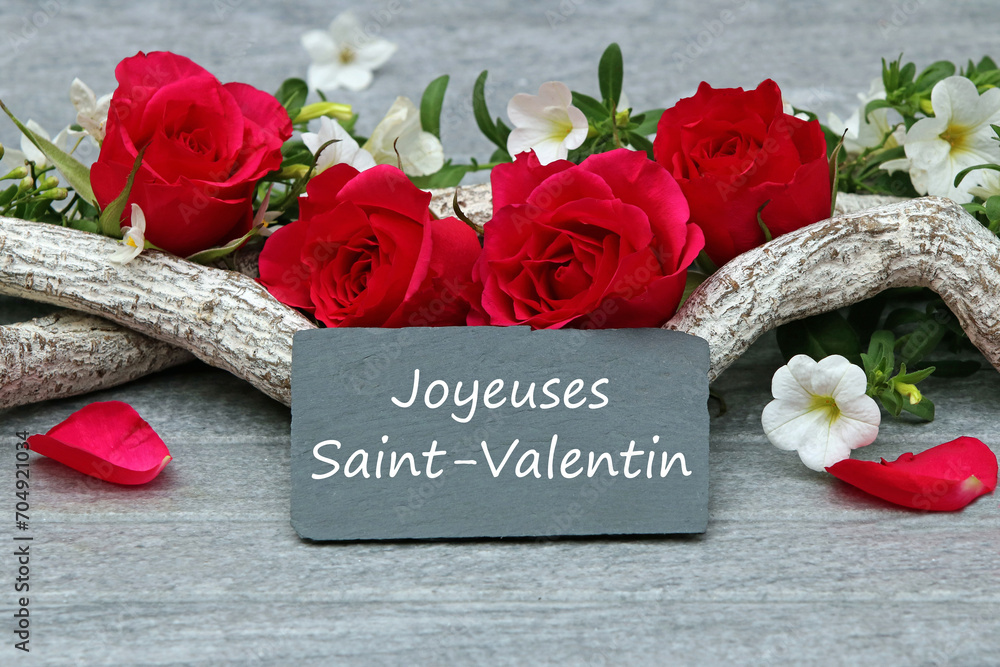 Arrangement de roses avec félicitations pour la Saint-Valentin. Joyeuse saint Valentin .