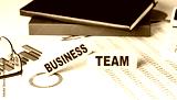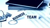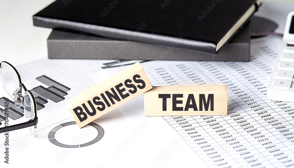 BUSINESS TEAM - text on a wooden block with chart and notebook