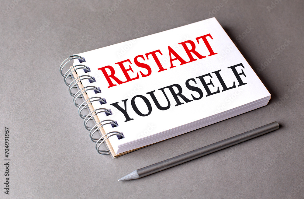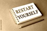 RESTART YOURSELF word on notebook on grey background