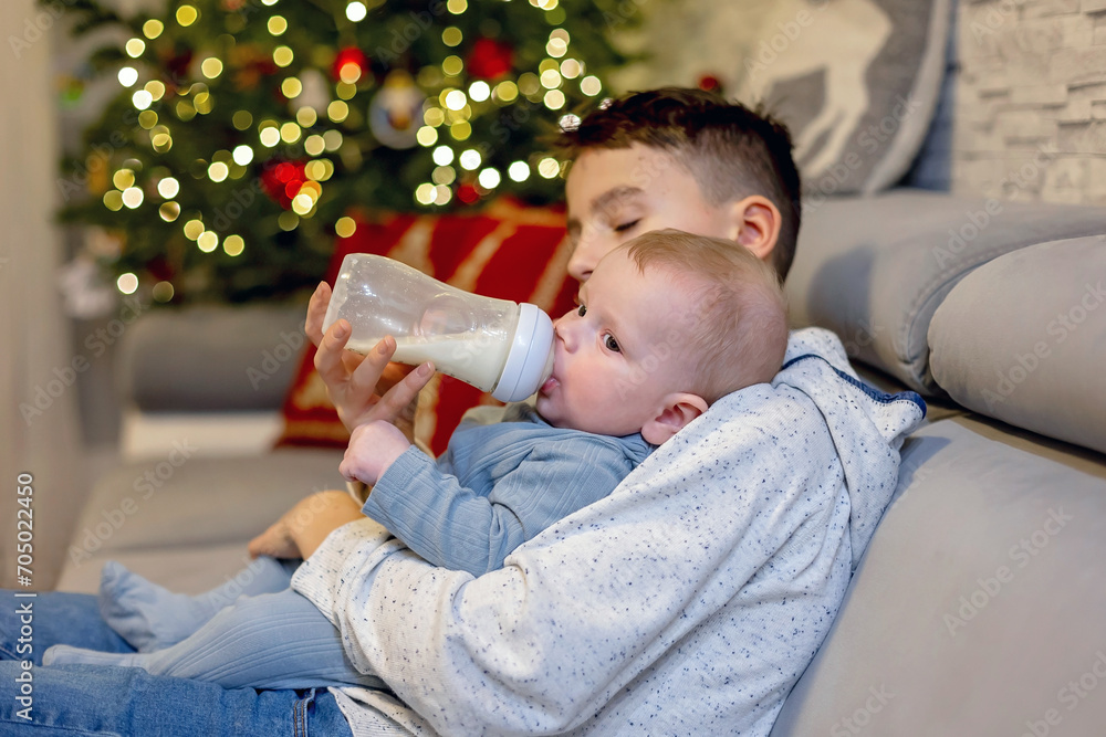 Happy family, newborn baby and older brothers, mom at home on Christmas