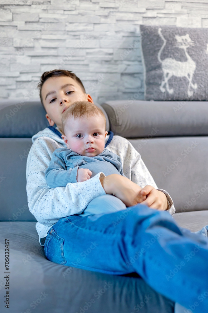 Happy family, newborn baby and older brothers, mom at home on Christmas