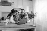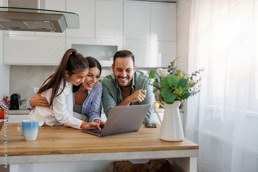 Happy family with daughter having fun in their kitchen, using laptop