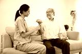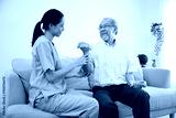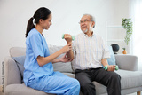 nurse or caregiver helping elderly patient to physiotherapist and exercise for rehabilitation at home