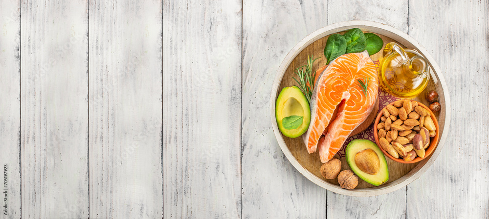 set of food with healthy fats and omega-3. Foods high in fatty acids including vegetables, seafood, nut and seeds. on a wooden background. top view. copy space