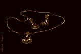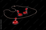 Jewelry (pendant and earrings) in white precious metal on black background. Beautifully cut red agate framed by rubies and diamonds. Background stacking. Copy space.