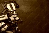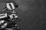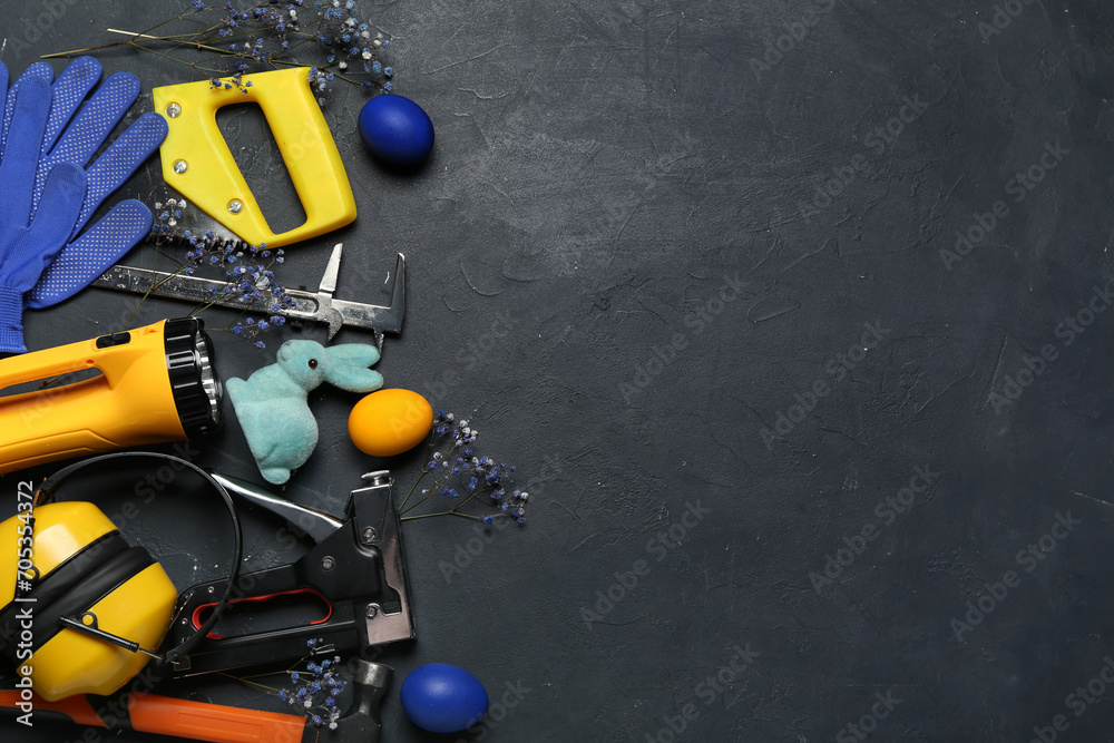 Construction tools with Easter eggs, rabbit and flowers on dark background