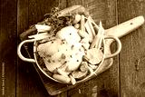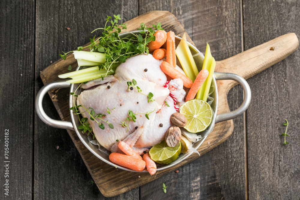 organic raw whole chicken with thyme peppers and garlic on a rustic table