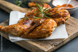 Whole roasted chicken rosemary. grilled barbecue delicious food on dining table at holiday celebrate