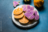 Halloween homemade gingerbread cookies background, close up
