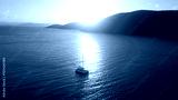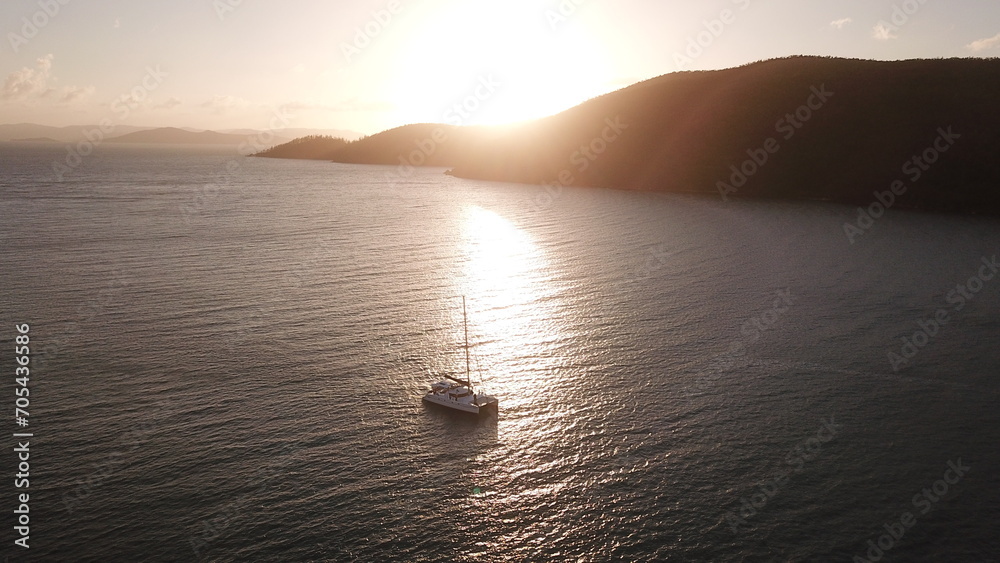 Catamaran in calm waters of Hook Island reef between Nara and Macona Inlets in Whitsunday Islands during Golden Hour Sunset, Queensland, Australia