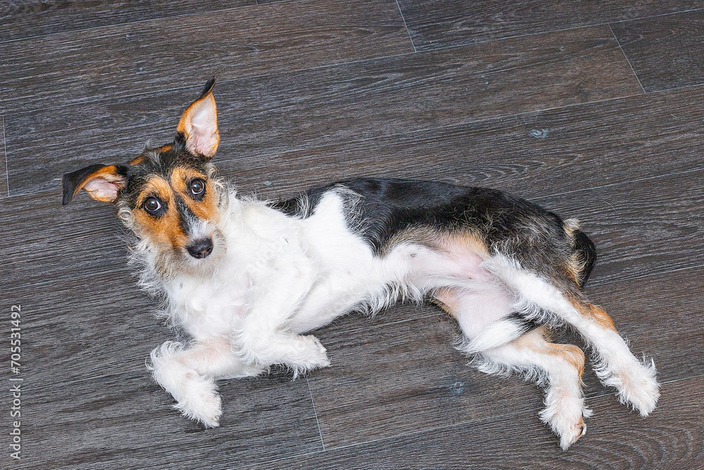 Jack Russell Terrier stands on its hind legs close-up. The dog in brown collar put its paw on the man's leg. Pet and owner top view photo.