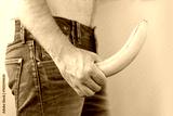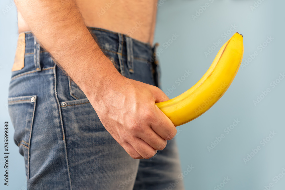 man's hand holds a banana on the background of a fly, close-up. Potency concept, impotence, male strength, pills to improve potency. copy space