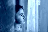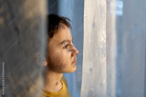 Artistic portrait of a teenage boy, standing next to a window, shadows from curtains falling on his face, making interesting shadows,