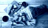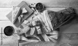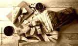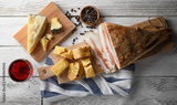 Savory biscuit with pecorino, guanciale and pepper. Cutting board with Italian rustic snack and red wine glass on white wooden background. close-up.