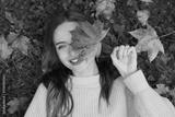 Smiling woman lying on grass and covering eye with autumn leaf, top view