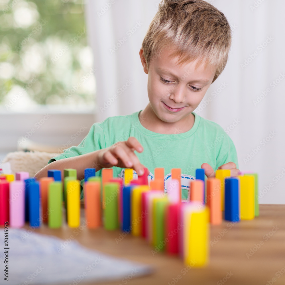 junge spielt mit domino-steinen