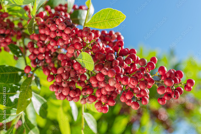 Fresh pink peppercorns on peruvian pepper tree branch. Blue sky at the background.