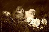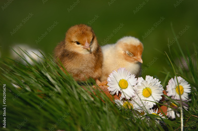 two cute baby chicks posing on grass and flowers in warm spring sun