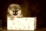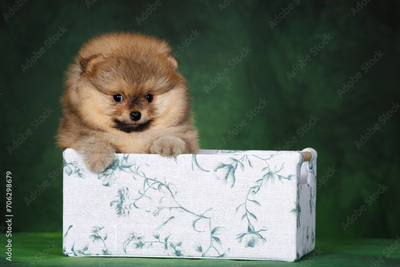 cute red pomeranian spitz puppy posing in a basket on green studio background