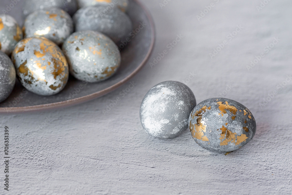 Stylish grey Easter eggs made of marble and concrete with a golden potala on a grey background. Coloring eggs with natural dye karkade tea. Environmental friendliness.The concept of a happy Easter.