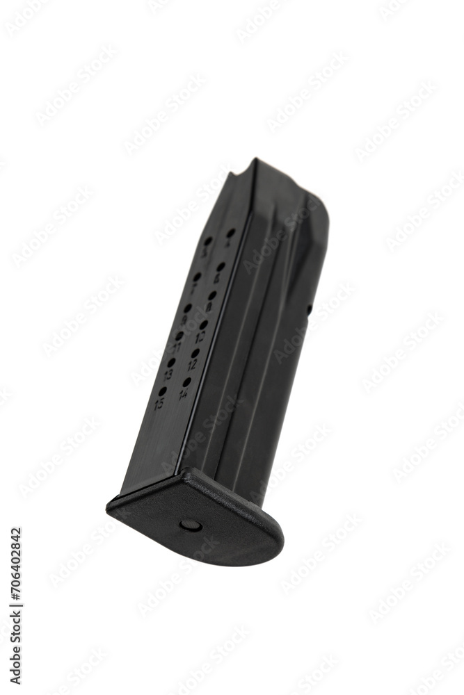 Metal pistol magazine for 9 mm cartridges. Clip for ammunition. Isolate on a white back.