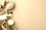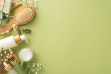 Earth-friendly self-care arrangement. Top view shot featuring jade roller, skincare essentials, wooden hairbrush, artisanal soap, eucalyptus, gypsophila on muted green background with space for text