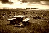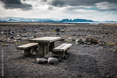 A wooden bench and table in a landscape for relaxing tourists on a desert Iceland, Europe