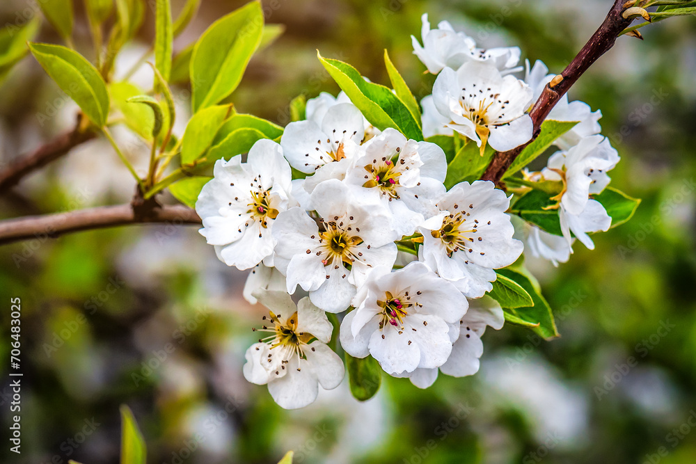 Blooming pear tree. White flowers on a pear tree. Spring background
