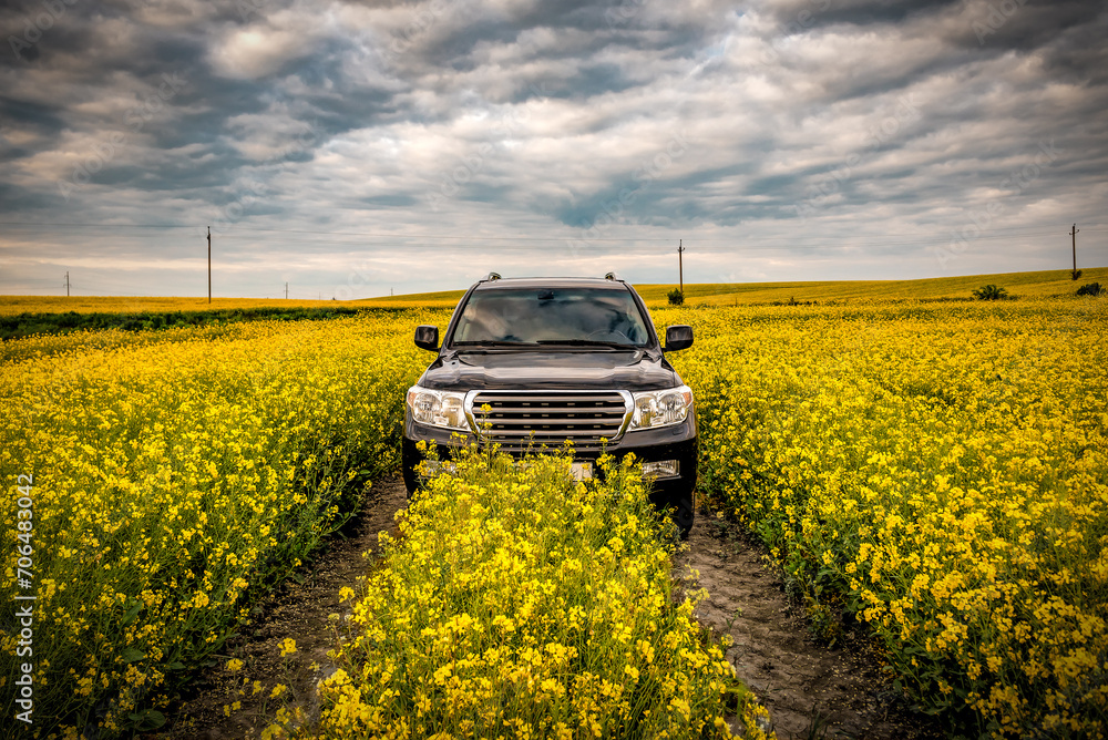 Black off road car is driving across the blooming yellow rape field under cloudy sky